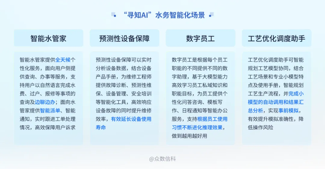 “寻知AI”智慧水务主要围绕水务服务与管理中智能化落地痛点,聚焦智能水管家、预测性设备保障、数字员工、工艺优化调度助手四大板块智能体研发。
